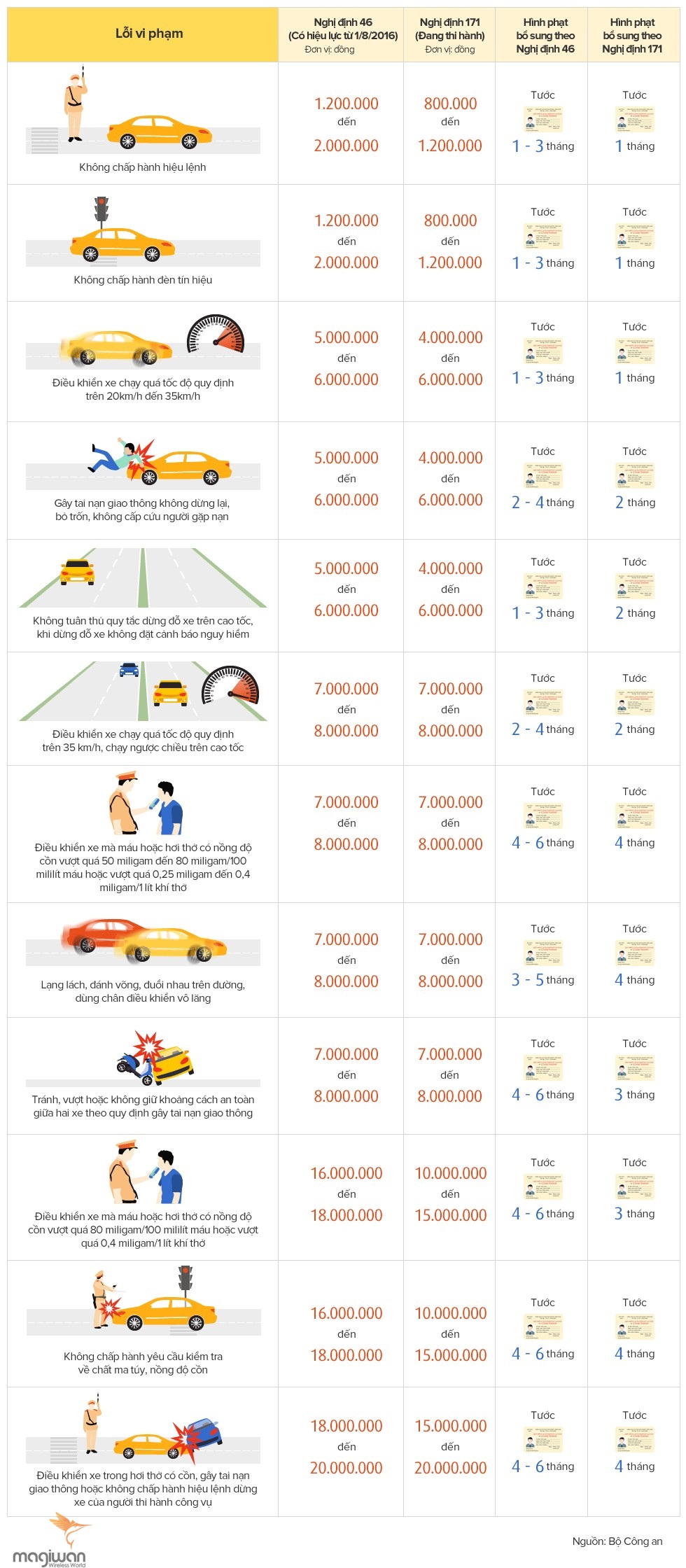 Từ ngày 1/8/2017 các lỗi vi phạm giao thông phổ biến với ôtô sẽ tăng mức phạt từ 2 đến 4 triệu đồng, kéo dài thời gian tước giấy phép lái xe so với quy định hiện hành. Magiwan thống kê các mức phạt khi vi phạm lỗi giao thông từ 1/8/2017 như sau: